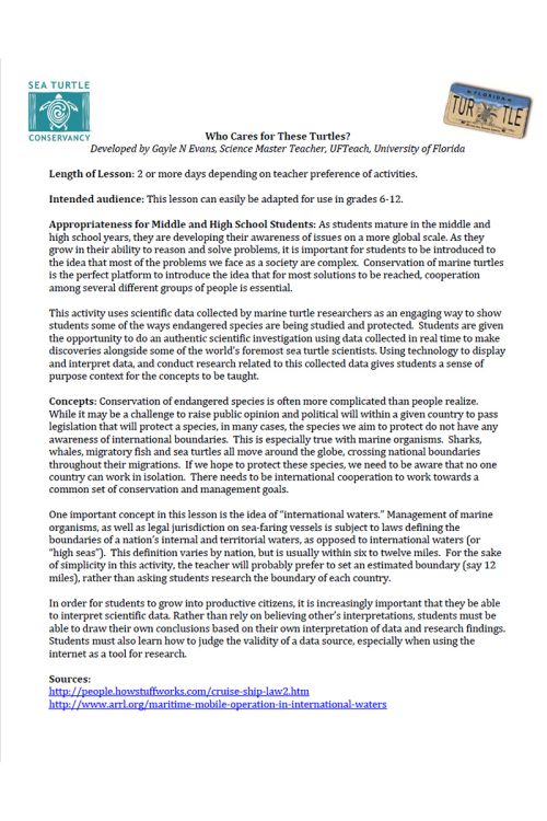 Appropriateness for Middle and High School Students: As students mature in the middle and high school years, they are developing their awareness of issues on a more global scale. As they grow in their ability to reason and solve problems, it is important for students to be introduced to the idea that most of the problems we face as a society are complex. Conservation of marine turtles is the perfect platform to introduce the idea that for most solutions to be reached, cooperation among several different groups of people is essential.