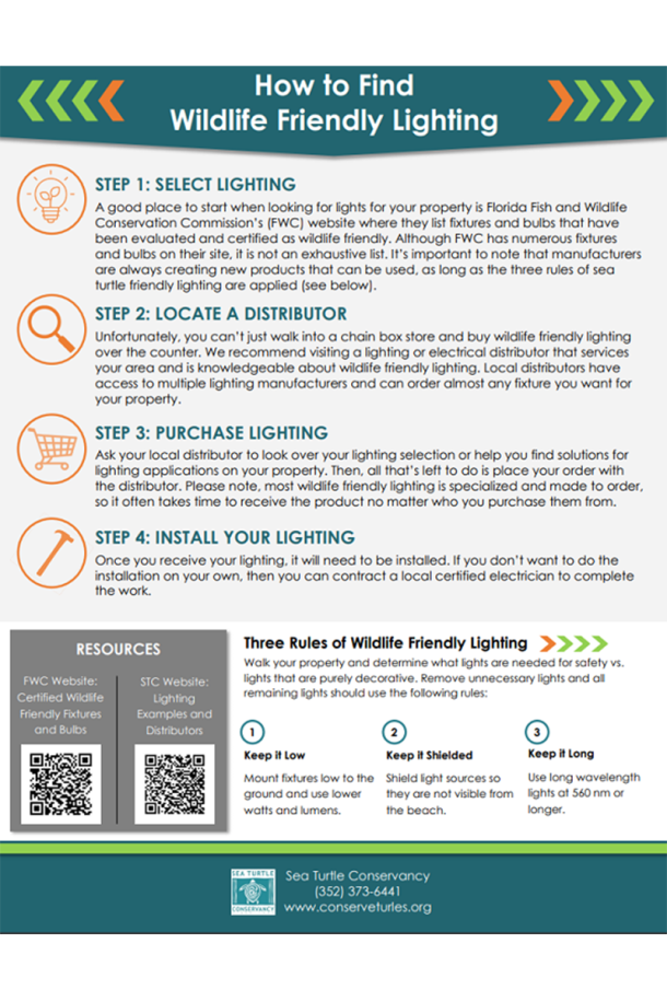 Encourage your community to update or implement a lighting ordinance for sea turtle protection by contacting your local representatives. If your town decides to update its streetlights, speak up and ask them to use wildlife friendly fixtures.