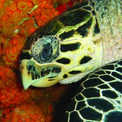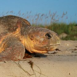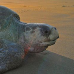 Sea turtles do not have teeth, but their jaws have modified “beaks” suited to their particular diet. They do not have visible ears but have eardrums covered by skin. They hear best at low frequencies, and their sense of smell is excellent. Their vision underwater is good, but they are nearsighted out of water. Their streamlined bodies and large flippers make them remarkably adapted to life at sea. However, sea turtles maintain close ties to land. Females must come ashore to lay their eggs in the sand; therefore, all sea turtles begin their lives as tiny hatchlings on land.
