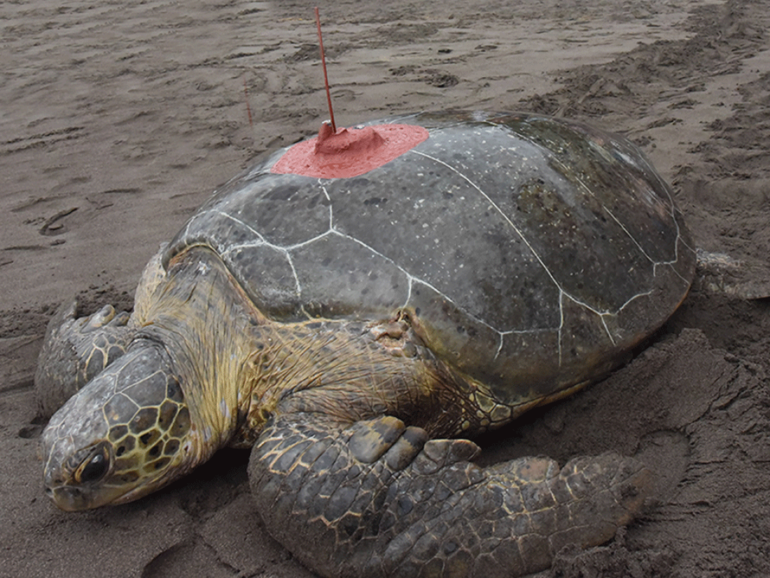 An adult female green sea turtle released with a satellite transmitter on September 20, 2022 from Tortuguero National Park in Costa Rica. She measured 105.5 cm curved carapace (shell) length and is part of a project to track green turtles nesting on the beach at the southern end of Tortuguero National Park.