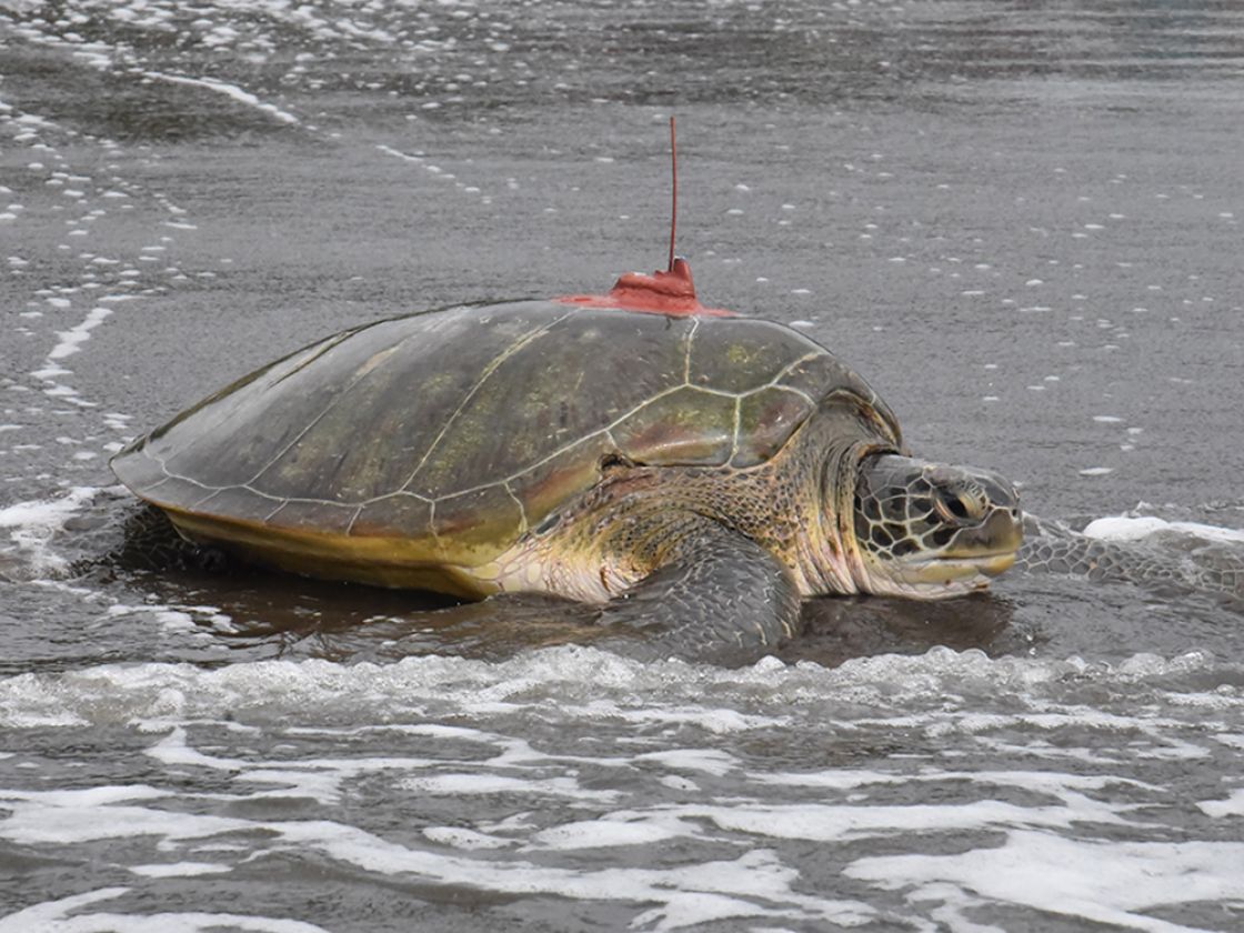 An adult female green sea turtle released with a satellite transmitter on September 19, 2022 from Tortuguero National Park in Costa Rica. She measured 104.5 cm curved carapace (shell) length and is part of a project to track green turtles nesting on the beach at the southern end of Tortuguero National Park. She was named by Sea Turtle Conservancy’s Research Assistants.