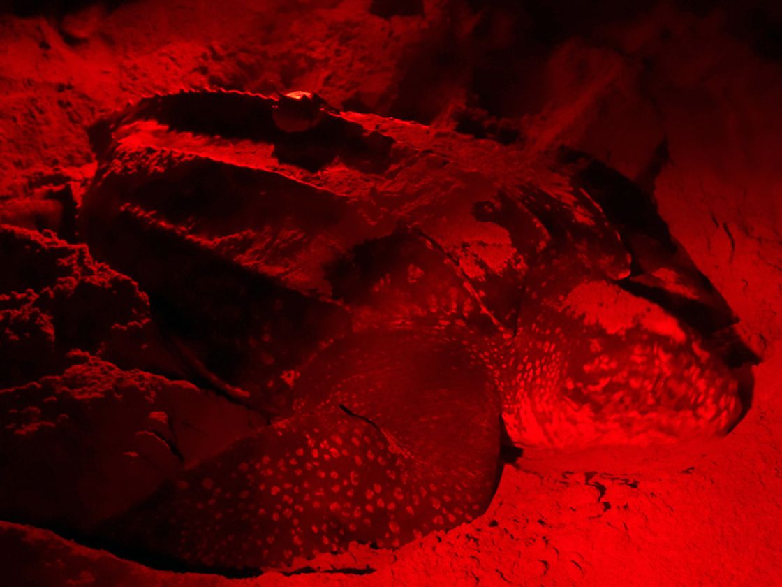 An adult female leatherback sea turtle released with a satellite transmitter from Chiriqui Beach, Panama on May 31, 2017. She measured 151.1 cm in curved carapace (shell) length and 107.6 cm in curved carapace width. She was previously flipper tagged earlier in 2017.