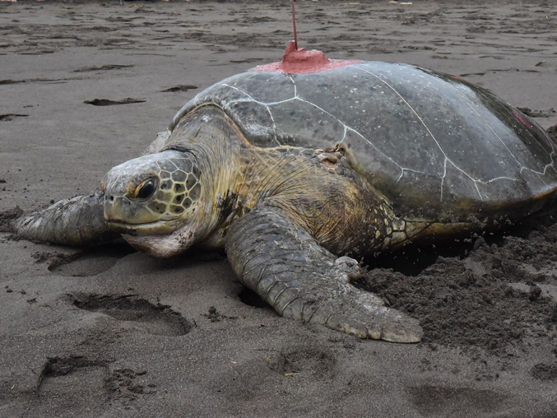 An adult female green sea turtle released with a satellite transmitter on September 21, 2023 from Tortuguero National Park in Costa Rica. “Mery” in Indigena dialect means “Woman”.  She measured 106.4 cm curved carapace (shell) length and is part of a project to track green turtles nesting on the beach at the southern end of Tortuguero National Park.