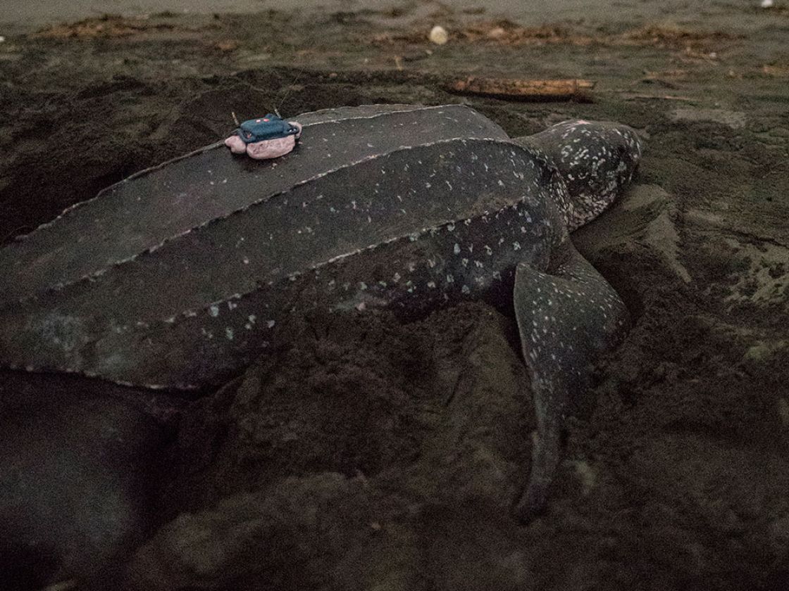 Mumu is an adult female leatherback sea turtle encountered nesting on May 24, 2021, on Soropta Beach, Panama. She is a large Panama leatherback measuring 166.9 cm curved carapace (shell) length and 118.9 cm curved carapace width, and she laid 102 fertile eggs and 41 infertile eggs. Mumu is taking part in the 2021 Tour de Turtles, and she was named by her Sponsor, Certina.