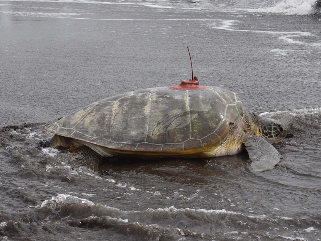An adult female green sea turtle released with a satellite transmitter on September 21, 2023 from Tortuguero National Park in Costa Rica. She measured 112.5 cm curved carapace (shell) length and is part of a project to track green turtles nesting on the beach at the southern end of Tortuguero National Park.