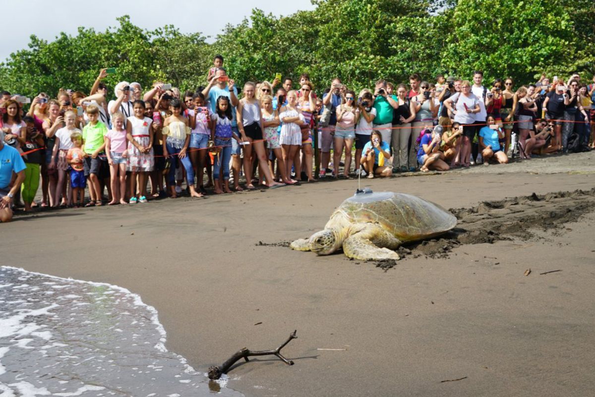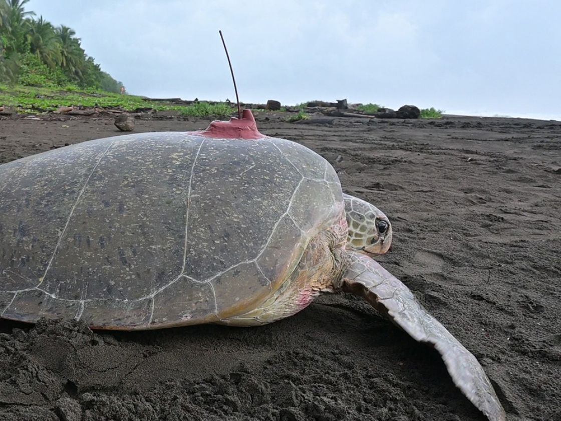 An adult female green sea turtle released with a satellite transmitter on September 20, 2023 from Tortuguero National Park in Costa Rica. She measured 100.7 cm curved carapace (shell) length and is part of a project to track green turtles nesting on the beach at the southern end of Tortuguero National Park.