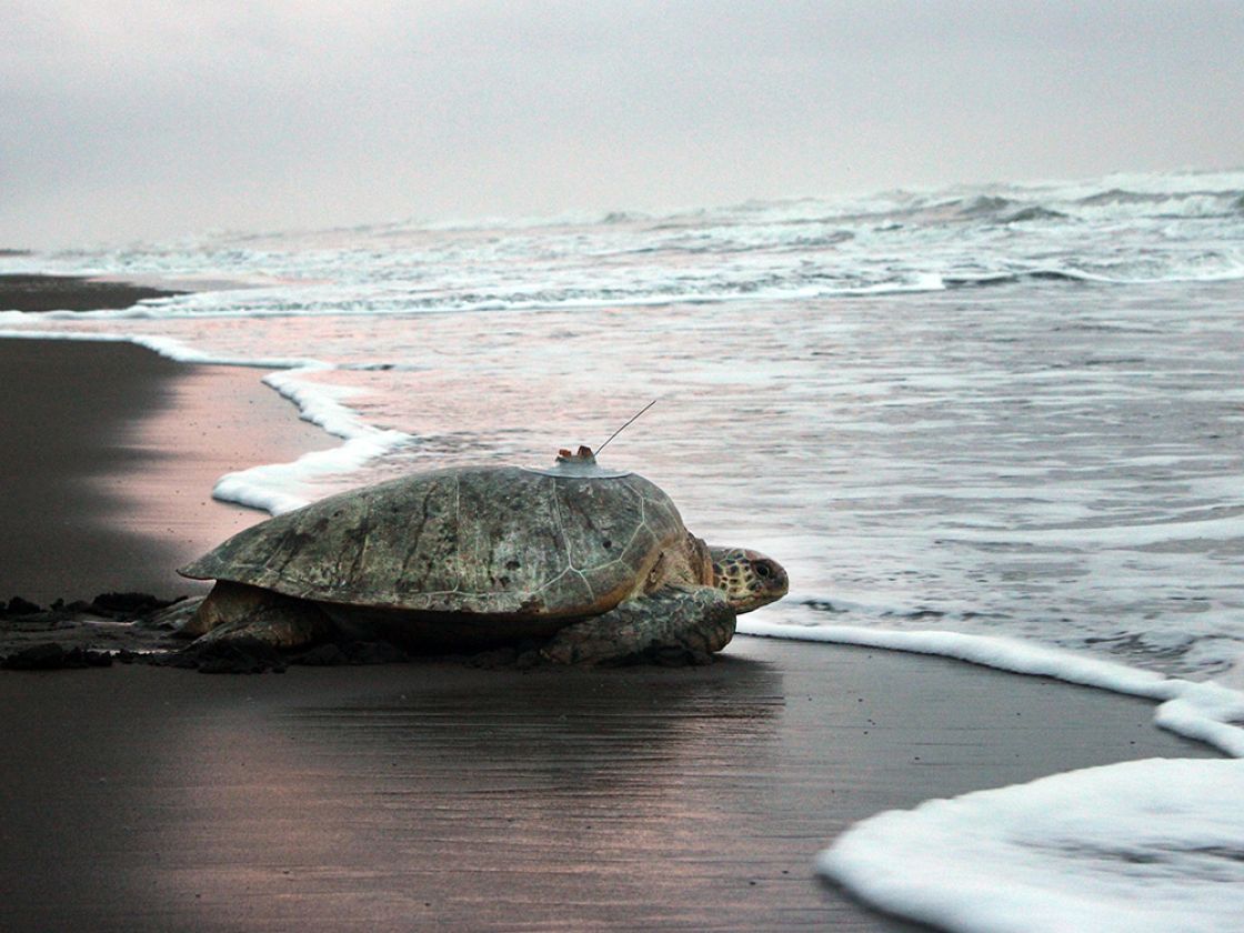 An adult female green sea turtle released with a satellite transmitter on September 26, 2024 from Tortuguero National Park in Costa Rica. She measured 94.8 cm curved carapace (shell) length and is part of a project to track green turtles nesting on the beach at the southern end of Tortuguero National Park.