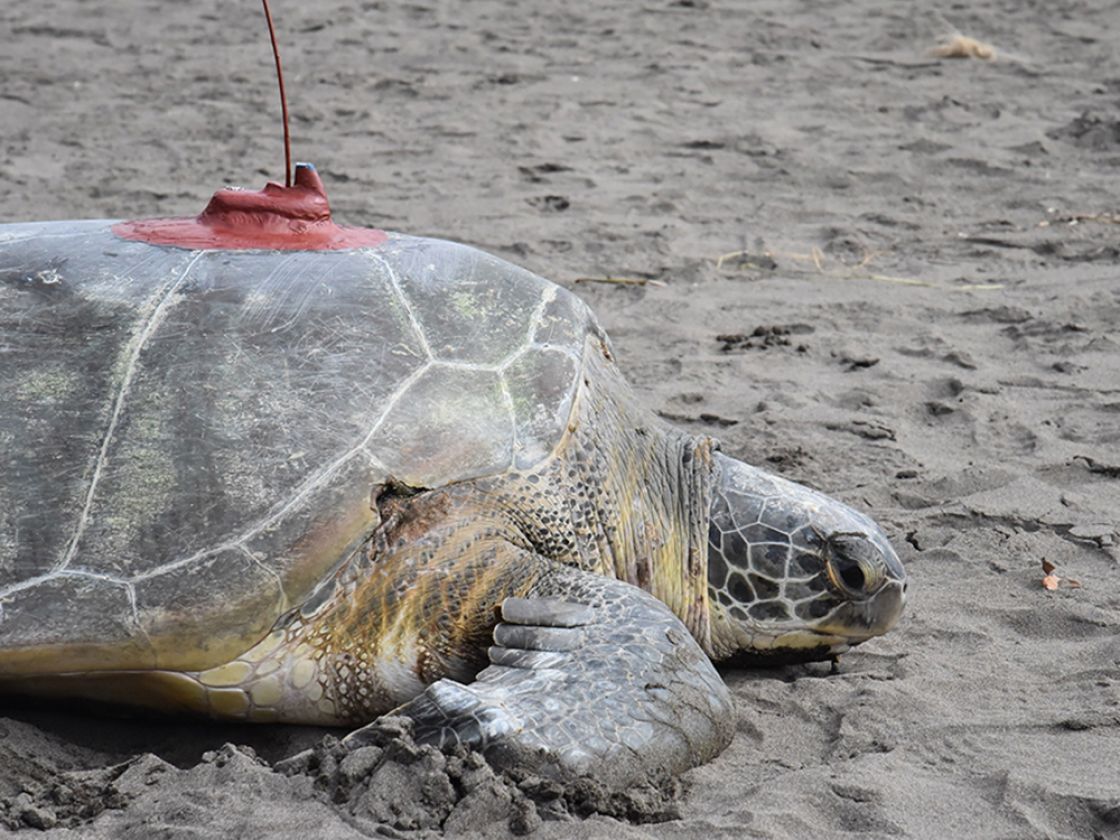 An adult female green sea turtle released with a satellite transmitter on September 20, 2022 from Tortuguero National Park in Costa Rica. She measured 112.5 cm curved carapace (shell) length and is part of a project to track green turtles nesting on the beach at the southern end of Tortuguero National Park. She was named by Sea Turtle Conservancy’s Research Assistants.