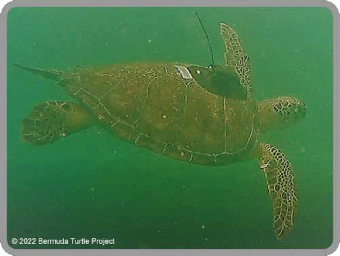 An immature green turtle that was captured in Paradise Lake Cove, Bermuda, on August 16, 2022. She measured 52.4 cm straight carapace (shell) length. The turtle was captured as part of the Bermuda Turtle Project which focuses on the study of immature green turtles in developmental habitat.