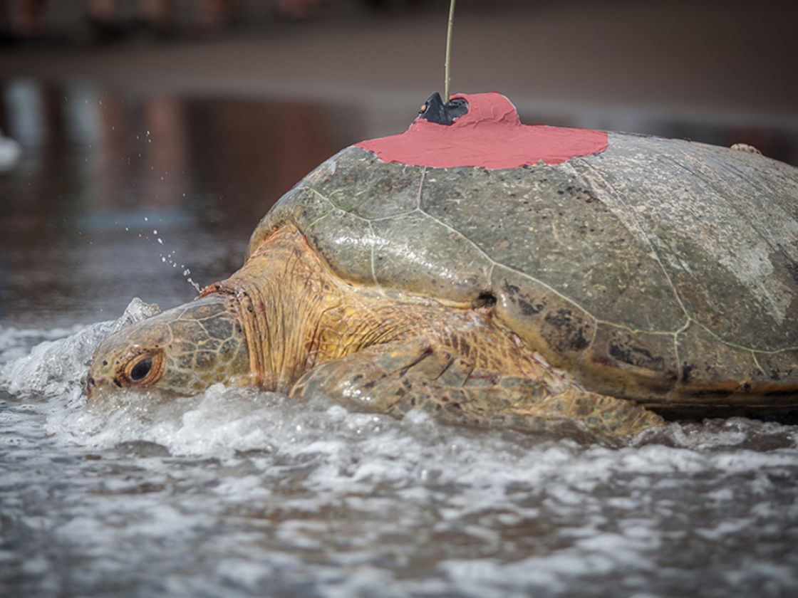 An adult female green sea turtle released with a satellite transmitter on September 19, 2022 from Tortuguero National Park in Costa Rica. She measured 99.9 cm curved carapace (shell) length and is part of a project to track green turtles nesting on the beach at the southern end of Tortuguero National Park. She was named by Sea Turtle Conservancy’s Research Assistants.