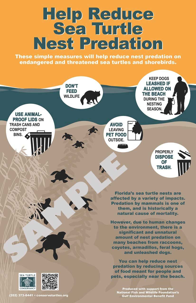 People can play a vital role in decreasing the threat of unnaturally high levels of nest predation. In many areas, trash left behind by humans encourages inland animals to migrate to beaches for food, further increasing sea turtle predators. Therefore, one of the easiest ways to help prevent invasive species predation is by disposing of trash and food properly.