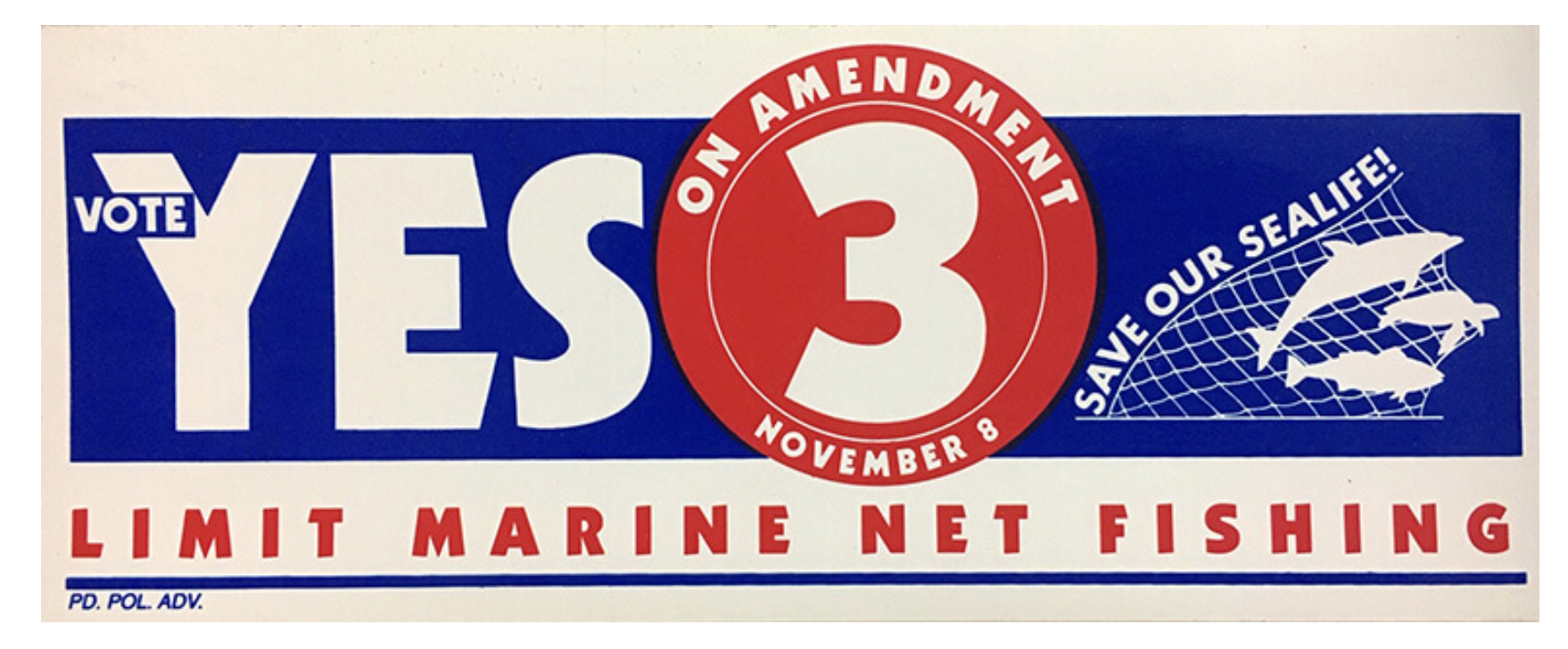 The regulatory history described above highlights the lengths that the Marine Fisheries Commission and the Department went to balance the needs of commercial net fisheries with sea turtle conservation. However, not all Floridians viewed these efforts as adequate. Chief among those was Karl Wickstrom, publisher of the Florida Sportsman, a magazine that catered to the State’s powerful recreational hunting and fishing constituency. Wickstrom first brought attention to a ban on gill nets in a 1991 column.[42] After receiving positive responses in support of the ban from readers, Wickstrom was inspired to begin the Save Our Sealife (S.O.S.) initiative, which launched a campaign in 1992 to eliminate net fishing across the state via an amendment to the State constitution (“Amendment 3”).[43] S.O.S. took issue with commercial fishermen using gill and trammel nets to contribute to overfishing, and it perceived the state agencies as failing to defend against this threat, at the expense of the lucrative recreational fishing industry, as well as incidental bycatch such as sea turtles.[44]