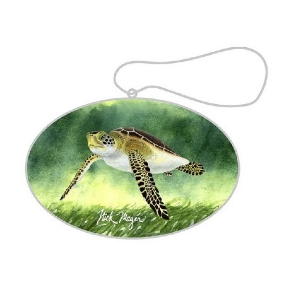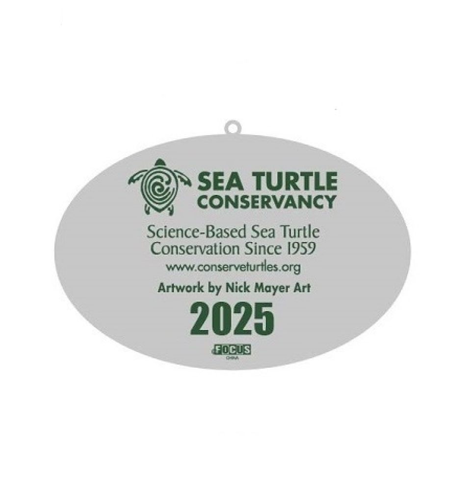 The 2025 ornament features an artist’s rendition of a green turtle swimming. The slogan “Science-Based Sea Turtle Conservation Since 1959” and the year 2025 are engraved on the back.