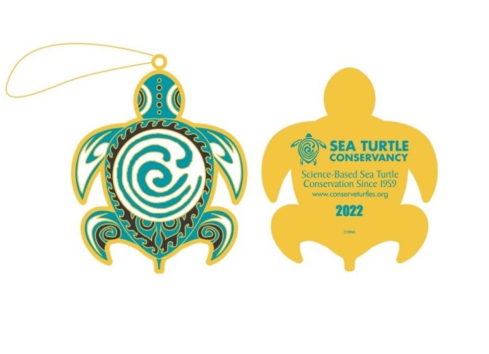 The 2022 ornament features a sea turtle graphic. The slogan “Science-Based Sea Turtle Conservation Since 1959” and the year 2022 are engraved on the back.