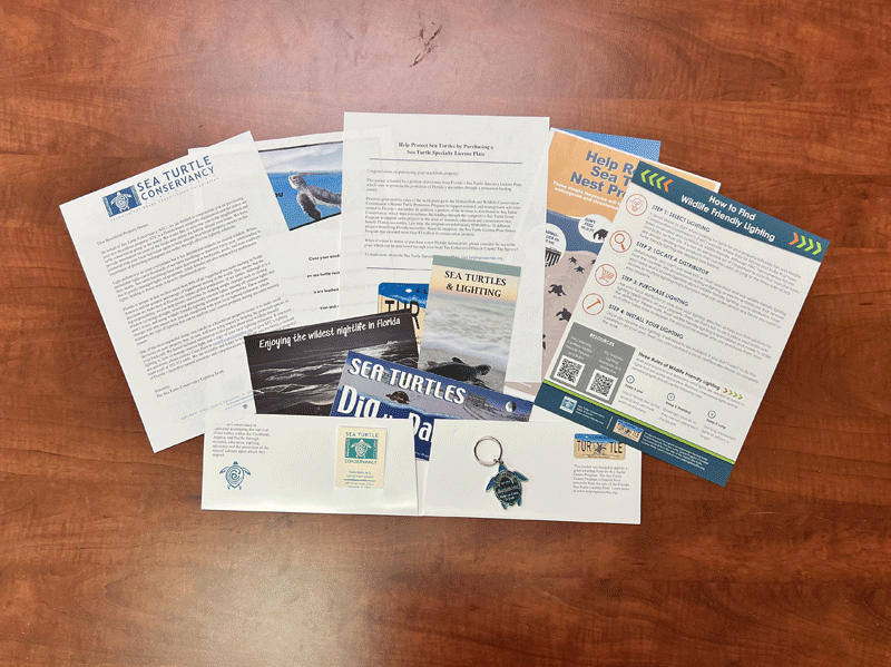 Real estate packets include information about where to find wildlife friendly lighting, the benefits of purchasing a sea turtle license plate, the importance of dunes, and steps a property owner can take to minimize predation. The packet also includes various educational materials and key a chain that can be attached to the property’s key at closing. All materials are provided in a folder with art designed by a local Florida artist.