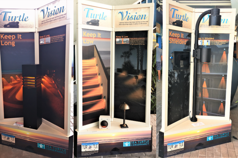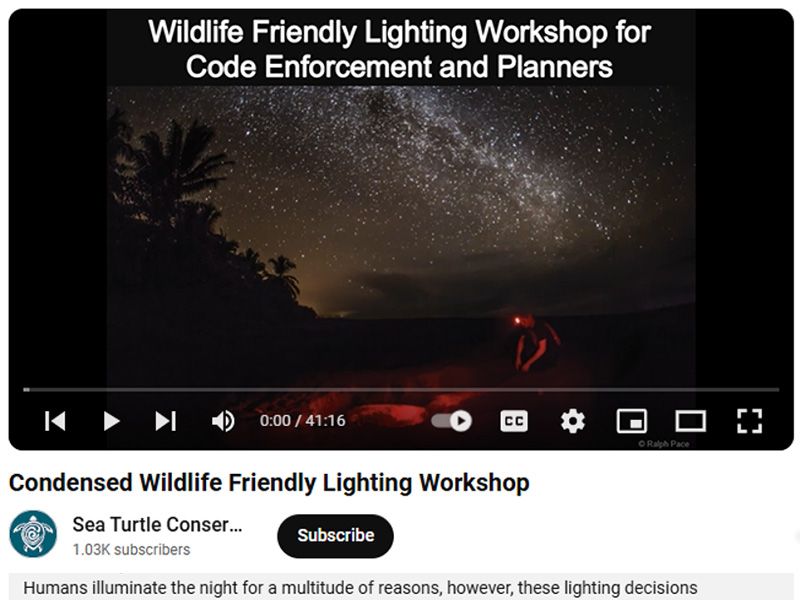 Sea Turtle Conservancy (STC) works on multiple initiatives and offers workshops to help reduce the negative impact of artificial light on sea turtle nesting beaches. STC offers a variety of outreach tools, including training for code enforcement personnel and lighting professionals, expertise to assist local governments with lighting ordinance updates, resources for new coastal property owners, engagement with coastal hardware stores to carry wildlife friendly lights, and lighting displays that can be used to educate local communities about managing problematic lights.