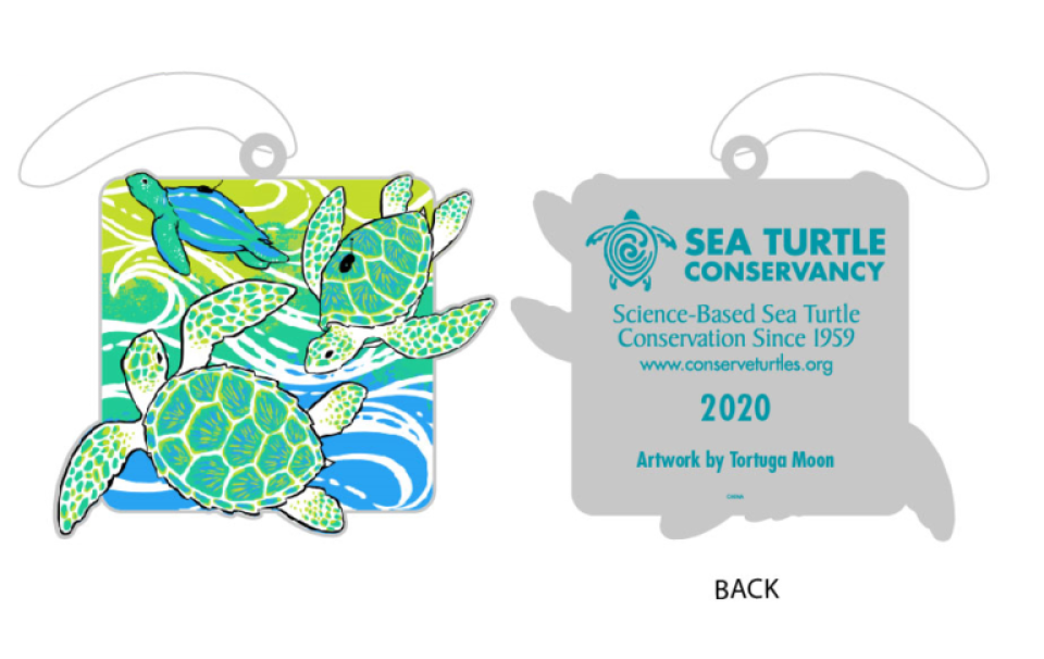 The 2020 ornament features our Tour de Turtles design. The slogan “Science-Based Sea Turtle Conservation Since 1959” and the year 2020 are engraved on the back.